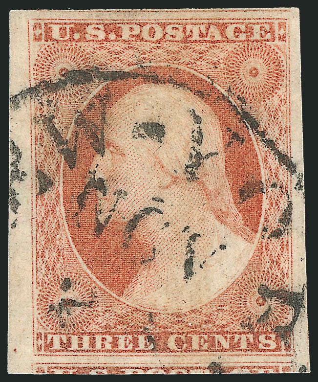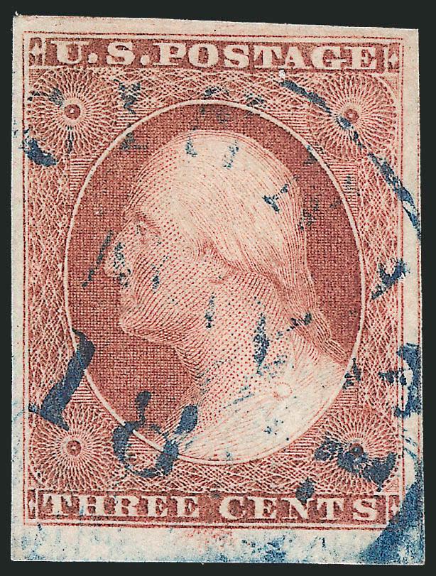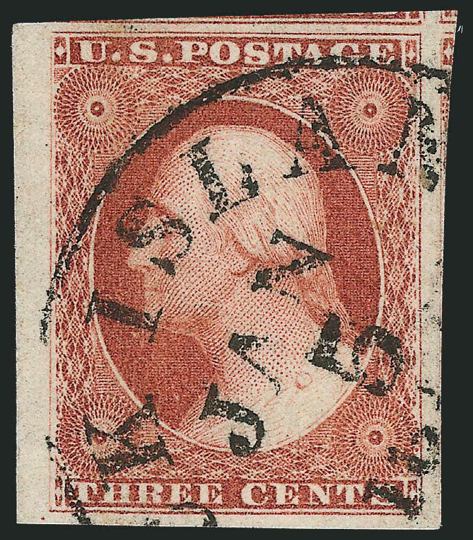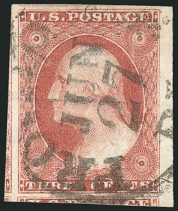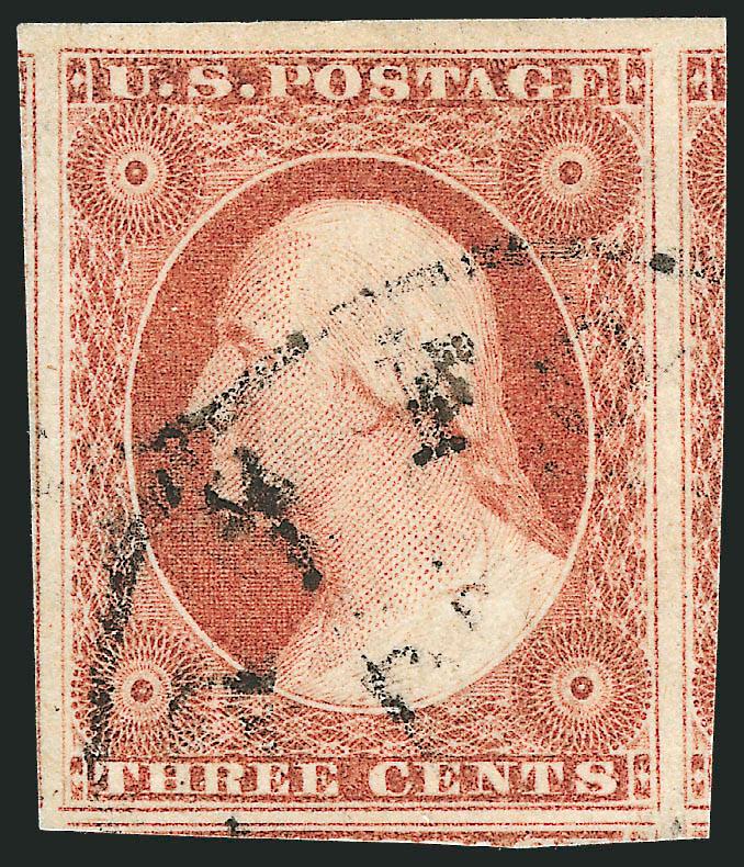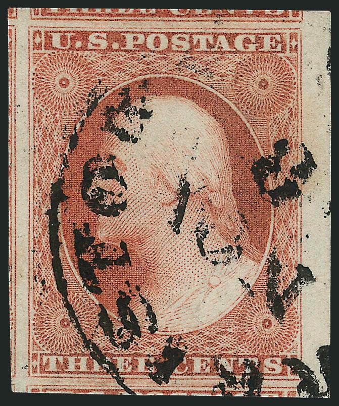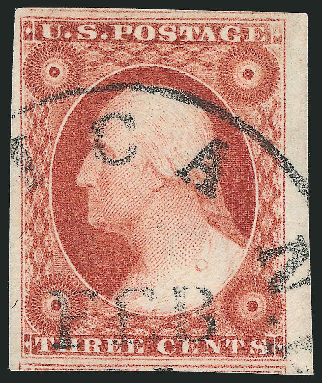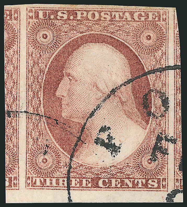 443   Image3c Pale Claret, Ty. II (11A). Position 61R2L, huge margins including left sheet margin, portions of adjoining stamps at top and bottom, New York town cancel, Extremely Fine Gem (Image)