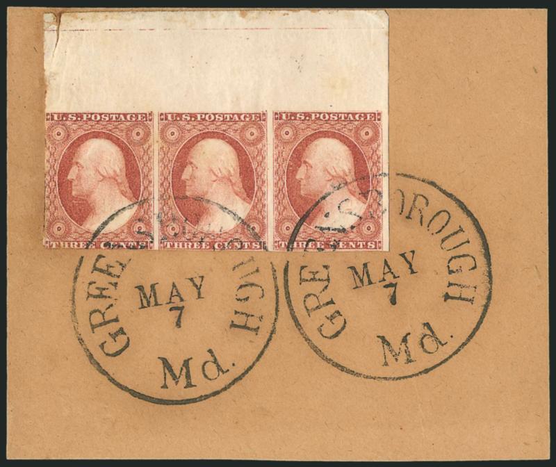 448   Image3c Claret, Ty. I (11). Strip of three with enormous top sheet margin showing the edge of the plate, just in at left and bottom left, rich color, tied by two clear strikes of large "Greensborough Md. May 7" circular datestamp to brown piece, small corner crease at bottom left, some minor selvage flaws, Fine-Very Fine appearance, a striking position piece, Scott Retail as Dull Red strip of three (Image)