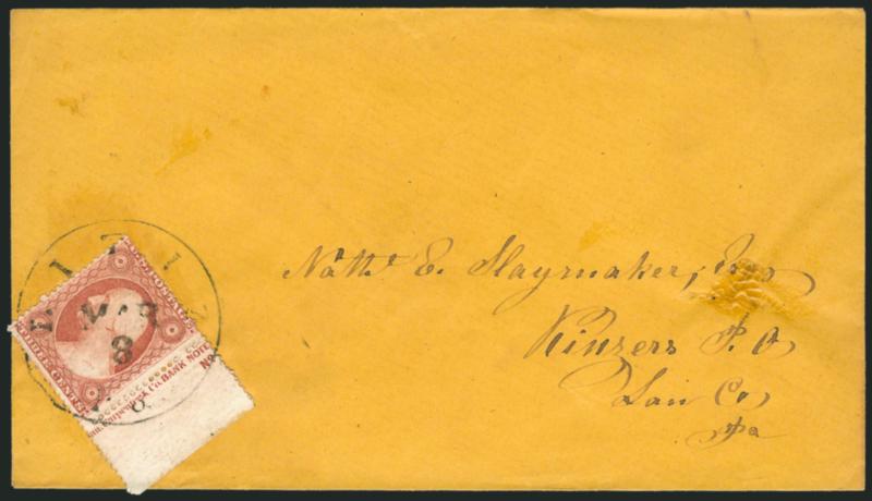 499 c Image3c Dull Red, Ty. III (26). With right sheet selvage, part imprint and "No.", tied by circular datestamp on buff cover to Kinzers Pa., Fine, an attractive position piece on cover (Image)