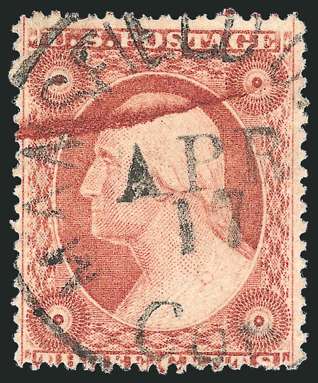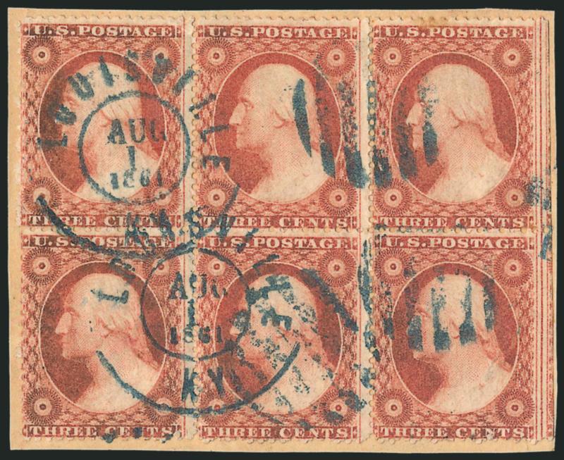 509 bl Image3c Dull Red, Ty. III (26). Horizontal block of six with right straddle-pane margin, deep rich color nicely complemented by blue "Louisville Ky. Aug. 1, 1861" double-circle datestamps and grids, couple small flaws including light creases, Fine appearing and desirable position piece, Scott Retail as block of four and pair (Image)