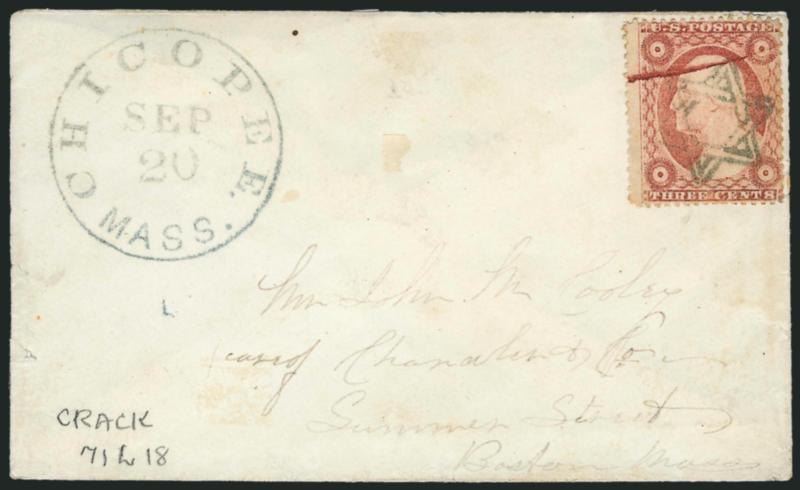 501 c Image3c Dull Red, Ty. III, Plate Crack (26 var). Position 71L18, rich color which clearly shows the variety, cancelled by Star of David fancy cancel, matching "Chicopee Mass. Sep. 20" circular datestamp on cover to Boston, trivial edgewear, Very Fine (Image)