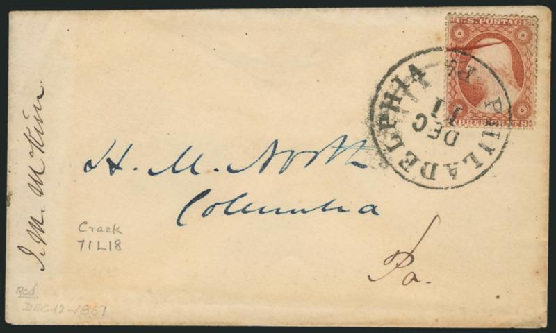 502 c Image3c Dull Red, Ty. III, Plate Crack (26 var). Position 71L18, bright shade, tied by "Philadelphia Pa. Dec. 11" circular datestamp on cover, placement of cancel leaves entire crack clearly visible, Very Fine (Image)