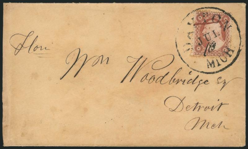 503 c Image3c Dull Red, Ty. III, Plate Crack (26 var). Position 71L18, tied by bold "Dayton Mich. Jul. 8" circular datestamp with day changed to "10" in manuscript on cover to Detroit Mich., slightly reduced at left and some slight soiling, Very Fine example of this plate variety used on cover (Image)