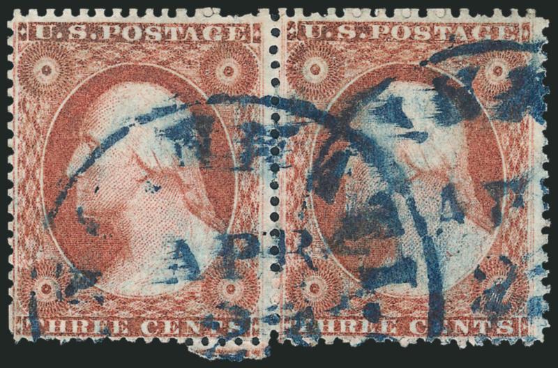 504   Image3c Dull Red, Ty. III, Triple Frameline (26). Positions 99R15 and 7R15, latter in a pair with 6R15, both stamps show triple frameline at left, pair with neat strikes of blue circular datestamp, Fine-Very Fine, these are reported to be the only two positions on the perforated plates that produced a triple frameline, unlisted in Scott (Image)