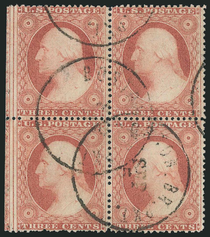 507 bl Image3c Dull Red, Ty. III (26). Block of four with left straddle-pane margin, radiant color, neat strikes of "Boston Br. Pkt. Sep. 5" circular datestamps, Extremely Fine, a beautiful block (Image)