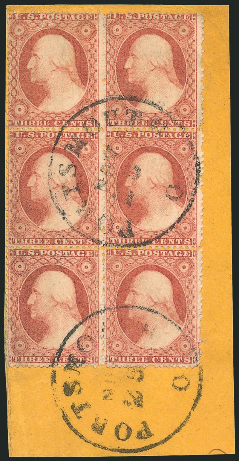 508 bl Image3c Dull Red, Ty. III (26). Vertical block of six, tied by "Portsmouth O. Nov. 25" circular datestamps on yellow piece, couple small flaws including tiny thin top left stamp, Fine appearing large multiple, Scott Retail as block of four and pair (Image)
