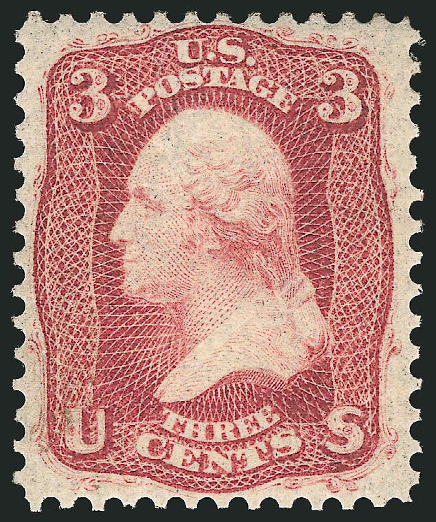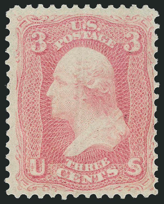 3c Pink (64). Unused (no gum), vivid color and clear impression, margins to touching at right, light vertical crease and small thin spot, appears Fine, the 3c Pink is rare in unused condition (Image)Search for comparables at SiegelAuctions.com |