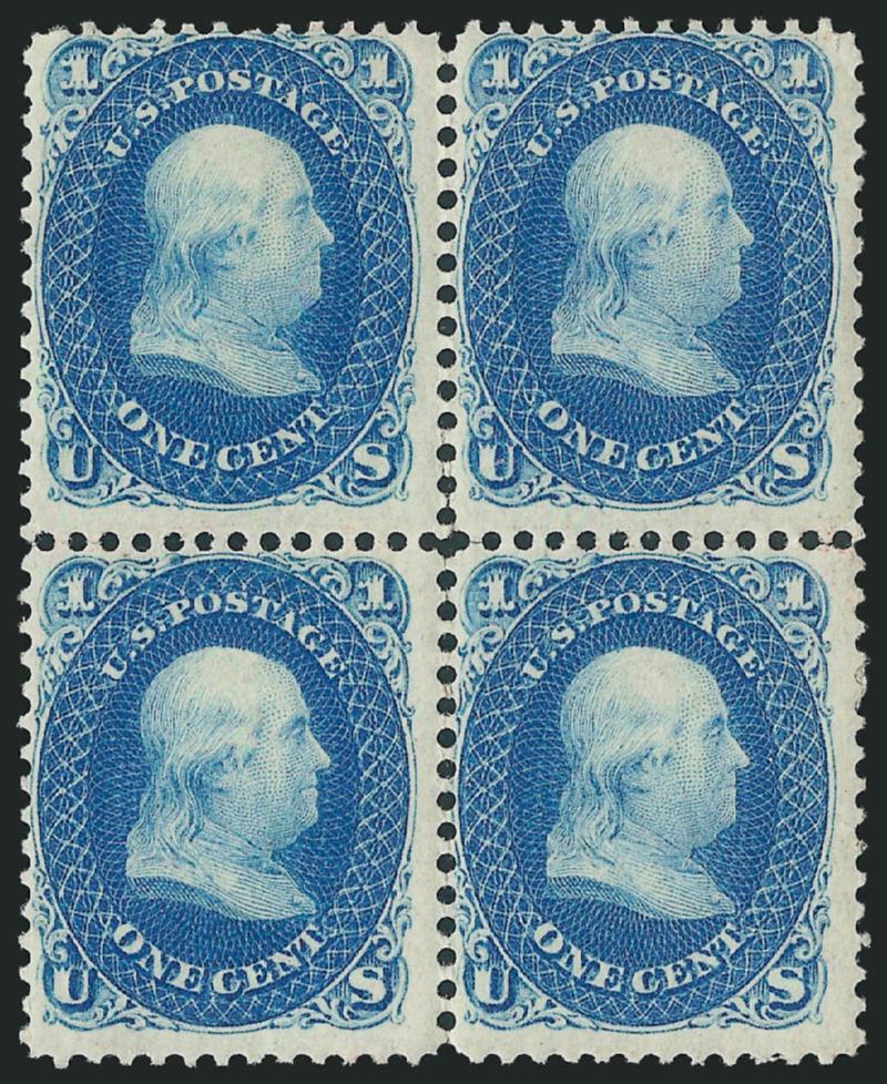 1c Blue (63). Block of four, original gum, top left stamp h.r., radiant color, top right stamp small corner crease at top right, few minor perf separations at center, Fine and scarce block (Image)Search for comparables at SiegelAuctions.com |