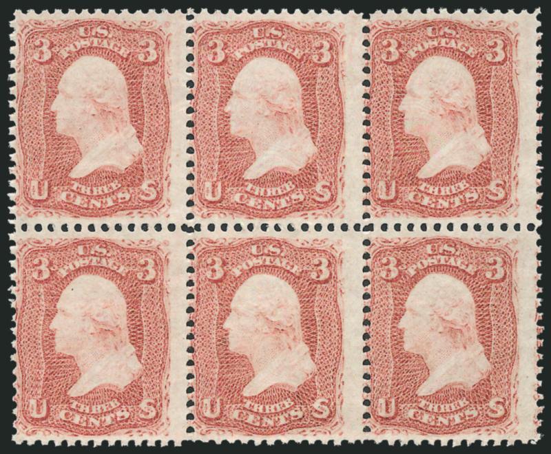3c Rose (65). Mint N.H. block of six, rich color on bright paper, fresh and Very Good, Scott Retail as hinged block of four and pair (Image)Search for comparables at SiegelAuctions.com |