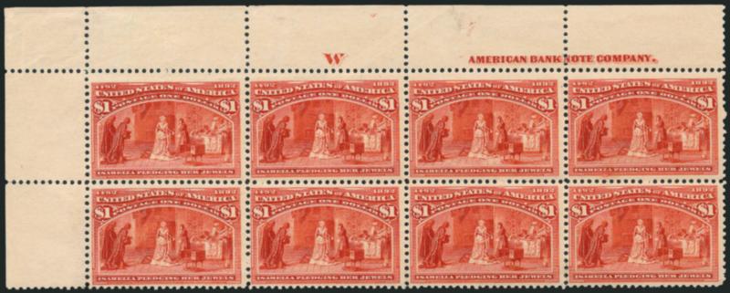 FINE-VERY FINE. AN IMPRESSIVE TOP LEFT CORNER SHEET SELVAGE BLOCK OF EIGHT OF THE $1.00 COLUMBIAN ISSUE.