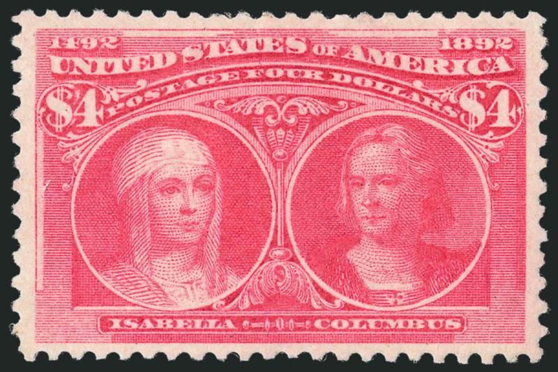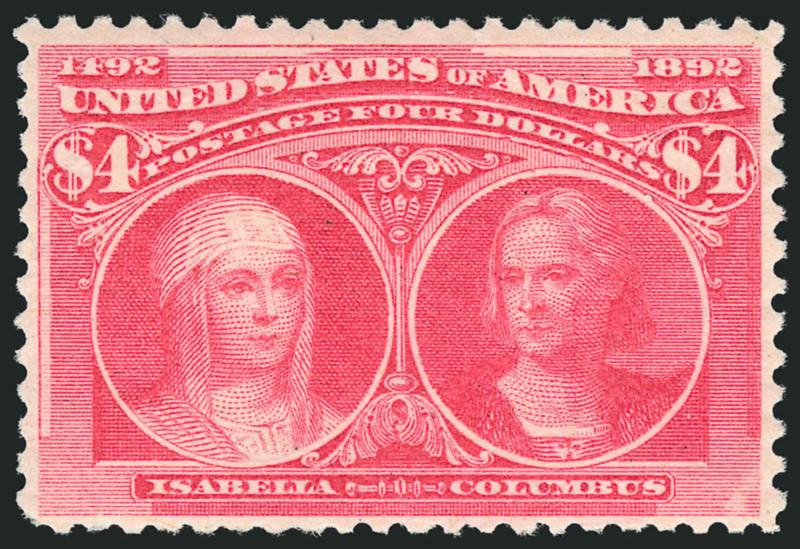 EXTREMELY FINE ORIGINAL-GUM EXAMPLE OF THE $4.00 COLUMBIAN ISSUE IN THE ROSE CARMINE SHADE.