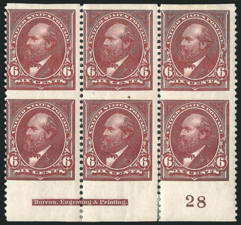 FINE. THE UNIQUE BOTTOM IMPRINT AND PLATE NUMBER BLOCK OF SIX OF THE 1894 6-CENT UNWATERMARKED BUREAU ISSUE IMPERFORATE HORIZONTALLY. ONE OF THE GREAT RARITIES OF THE ISSUE.