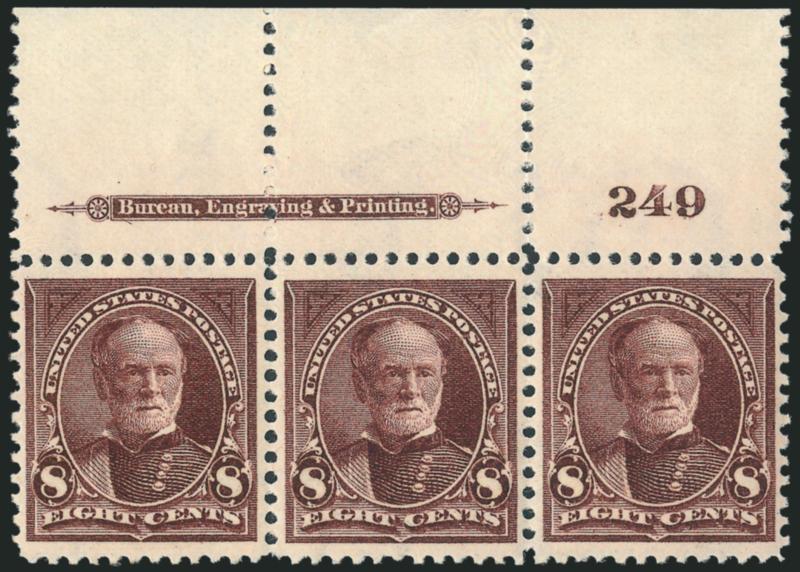 678 og Image8c Violet Brown (272). Top imprint and plate no. 249 strip of three, side stamps Mint N.H., center stamp lightly hinged, rich color on bright paper, well-proportioned margins, small fingerprint on gum of left stamp, Very Fine and choice, Scott Retail as singles (Image)