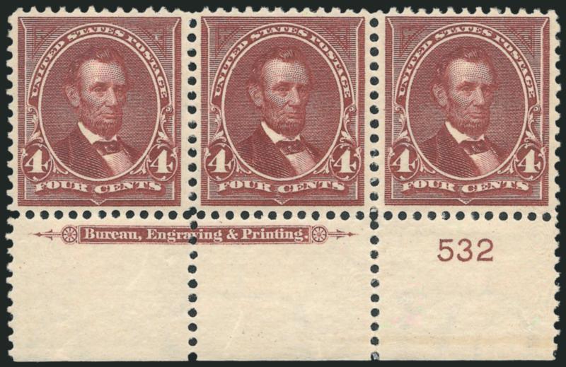 4c Rose Brown (280). Mint N.H. bottom imprint and plate no. 532 strip of three, warm color, well-balanced margins, Very Fine and choice (Image)Search for comparables at SiegelAuctions.com |