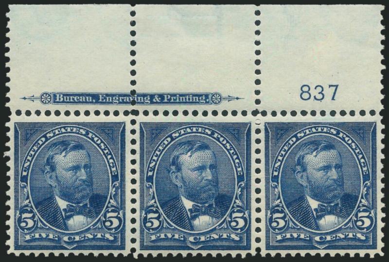 5c Dark Blue (281). Two Mint N.H. top imprint and plate no. strips of three with wide selvage, plate nos. 391 and 392, bright shade, Fine-Very Fine, Scott Retail as Mint N.H. singles Search for comparables at SiegelAuctions.com |
