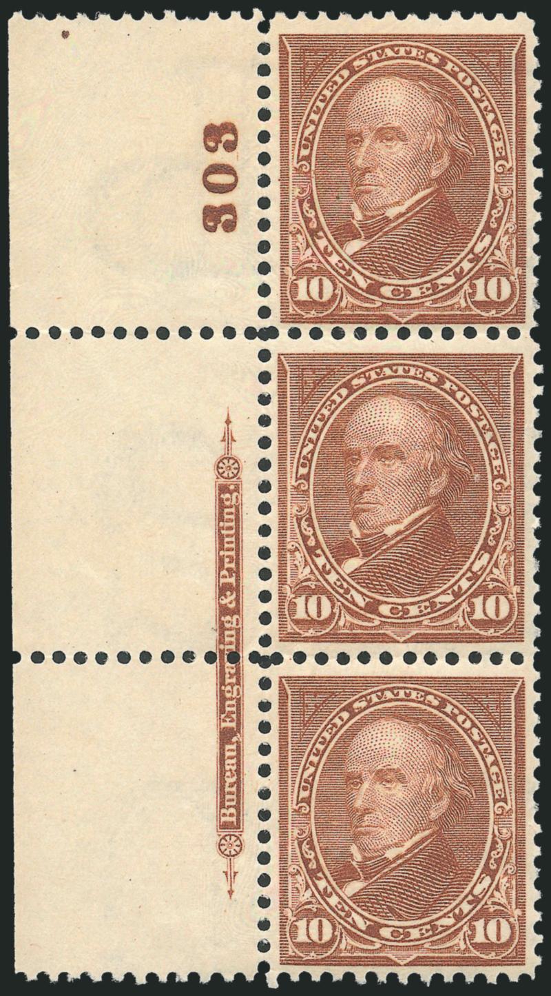 10c Brown, Ty. I (282C). Left imprint and plate no. 303 strip of three, original gum, lightly hinged, radiant color, fresh and Very Fine (Image)Search for comparables at SiegelAuctions.com |