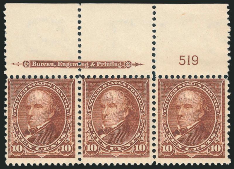 10c Brown, Ty. I (282C). Mint N.H. top imprint and plate no. 519 strip of three, pretty shade, Fine, Scott Retail as Mint N.H. singles (Image)Search for comparables at SiegelAuctions.com |