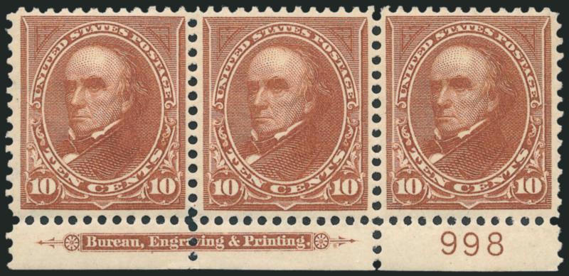 10c Orange Brown, Ty. II (283). Bottom imprint and plate no. 998 strip of three, side stamps Mint N.H., center stamp lightly hinged, brilliant color, well-balanced margins, Very Fine-Extremely