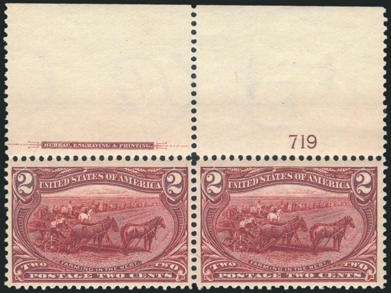 2c Trans-Mississippi (286). Four Mint N.H. imprint and plate no. pairs, plate nos. 619, 623, 719 and 725, rich colors, better centering than normally seen, Very Fine