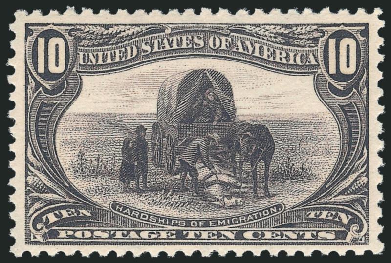10c Trans-Mississippi (290). Mint N.H. with top right corner sheet selvage, intense shade and proof-like impression, Very Fine (Image)Search for comparables at SiegelAuctions.com |