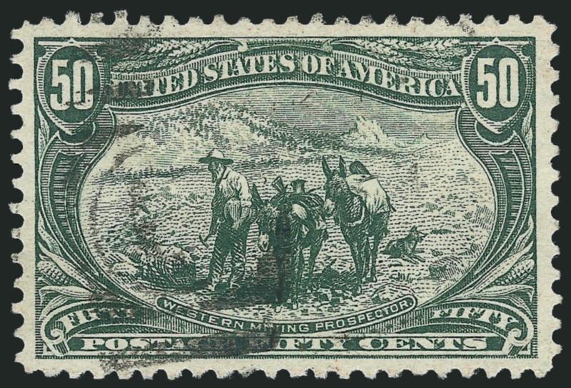 50c Trans-Mississippi (291). Uncharacteristically wide margins and excellent centering, rich color, lightly struck oval grid cancel, Extremely Fine, with 2007 P.F. certificate (XF 90) (Image)Search for comparables at SiegelAuctions.com |