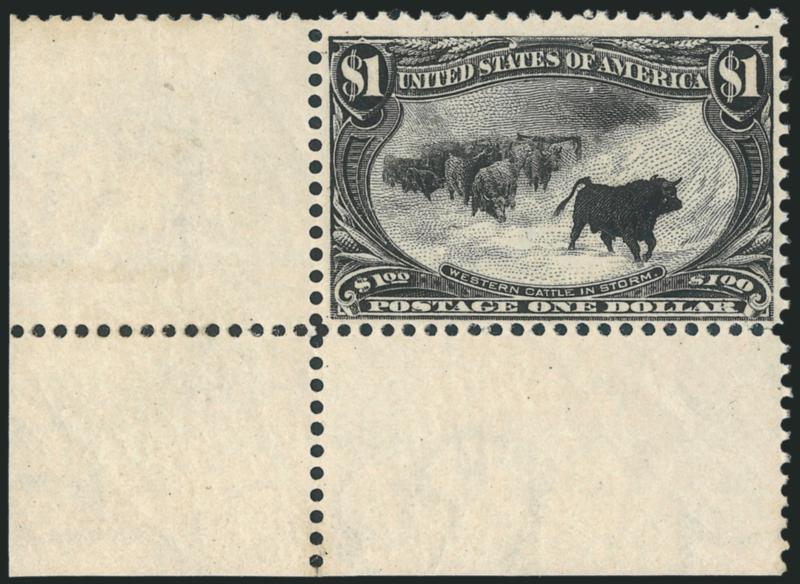 $1.00 Trans-Mississippi (292). Mint N.H. with bottom left corner sheet selvage, detailed impressionVERY FINE A BEAUTIFUL MINT NEVER-HINGED CORNER SELVAGE SINGLE OF THE $1.00