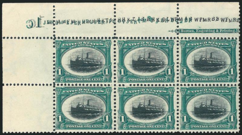 741 nhbl Image1c Pan-American (294). Mint N.H. block of six with top left corner sheet selvage and part imprint, denomination and initials in selvage, intense colors, choice centering throughout, Very Fine-Extremely Fine, Scott Retail as singles (Image)