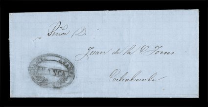 entire folded letter to Cochabamba, interestingly datelined Pampagrande"Chilon/Franca" black pictorial oval, Department of Santa Cruz, a delightful and perfectly struck postmark in intense black ink with leaf fronds in the center, on clean 1860 entire folded letter to Cochabamba, interestingly datelined Pampagrande which is in the adjoining Department of Cochabamba, choice very fine; a rare and beautiful cover that possesses marvelous eye appeal. (Image) Est. $500-750