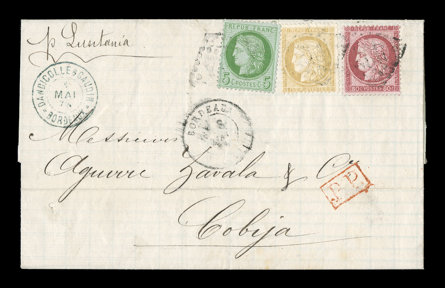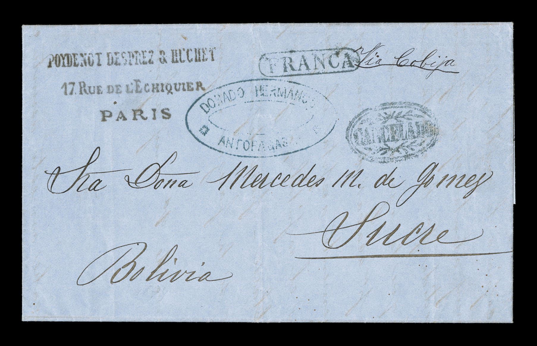 eleven covers are franked with various issues of stamps from the imperfor1855-75 France inbound to Bolivia postal history collection, assemblage of sixteen covers mounted and written up on pages showing an interesting range of usages to Bolivia, eleven covers are franked with various issues of stamps from the imperforate Napoleons to the 1870's perforated Ceres issues, most of the earlier covers with imperforate and perforated Napoleon issues were sent via British packet by way of Panama, includes two covers prior to 1862 when the British post office in Cojiba was opened, but most of the later went through that post office and includes a July 1862 quadruple rate cover with two horizontal strips of three of the 80c Rose on pinkish (#20) with clear "Cobija/C/JY 10 62" c.d.s. being a very early marking of this British Agency post office in Bolivia, other attractive and colorful frankings paying single and double rates with various frankings, also five stampless covers, one an 1856 folded paid letter by British packet to Corocoro with "Lamar" straight line handstamp on arrival in Bolivia, plus four others carried or placed in the mails by forwarders including an 1874 cover to Sucre with fancy ornate "Cancelado" oval of Lamar and "Dorado Hermanos/Antofagasta" oval forwarding agent's handstamp, the collection is neat with mostly entire folded letters, condition of the stamps is varied but most are fine-very fine and an attractive collection of inbound mail. (imagea) (imageb) (Image) Est. $1,500-2,000