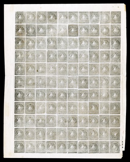 all three values are in the sheet, the top three horizontal rows are 11863 1/2r-2r Black Garcia essays, complete sheet of 110, an amazingly well preserved sheet in a deep shade of black that is strongly bronzed, the setting was laid out so that all three values are in the sheet, the top three horizontal rows are 1/2r, the next five are 1r and the final three rows are 2r, position 100 of the sheet is inverted in the black sheet making tete-beche pairs vertically or horizontally possible, this sheet is unusually choice with large selvage all around, folded along each side but margins are still well clear all around, without gum as issued, very fine and choice; at the petition of the government a contract for producing the first postage stamps was awarded to Justiniano Garcia in March of 1863, this contract was rescinded in April of that same year after stamps had been printed, however they remained unissued and none were placed in use; the black is rare in full sheets and especially so in this select quality; Scott values each impression at $75.00 or $8,250.00 for singles. (Image) Est. $2,000-3,000