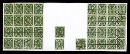 unused block of 35 making the first seven vertical rows of the sheet, po1867 5c Green, original plate, third state, a very rare plate reconstruction consisting of two impressive unused blocks, the first is believed to be the largest recorded unused block of 35 making the first seven vertical rows of the sheet, positions 1-7/49-55, this state of the plate had been enlarged to 65 by adding five positions at bottom on the right side, so the second block is a block of 30 (5x6) showing this additional row of five at bottom, positions 8-12/68-72 (positions #61-67 not yet added to the plate), both blocks are fresh with clear to large margins all around and each is in the same deep green shade; exceptionally rare for both the size of the multiples and as a reconstruction of this state of the plate which was not long used before it was changed again. (Image) Est. $2,000-3,000