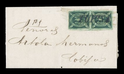 extra-large margins all around, on entire folded letter of June 18, 1868 to Cob1867 5c Green, fourth re-engraving, lovely vertical pair, positions 53/64, possessing deep aqua blue green color with a strong plate wash in the white areas, large to extra-large margins all around, on entire folded letter of June 18, 1868 to Cobija (Lamar), strong full "Tupisa" black straight line handstamp that bleeds to the inner letter sheet tying it to the cover, "Potosi" straight line transit on the reverse, couple of minor insect holes to the cover; very fine and an especially handsome cover. (Image) Est. $750-1,000