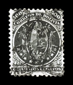 on bright fresh paper, plus nice even perforations all around, extreme#14, 1868 500c Black, unused, an unusually fresh example of this key value that is so highly prized by the collectors of Bolivia, beautifully centered with intense black color on bright fresh paper, plus nice even perforations all around, extremely fine for this rare stamp with only 5,000 stamps issued. (Image) Est. $200-300