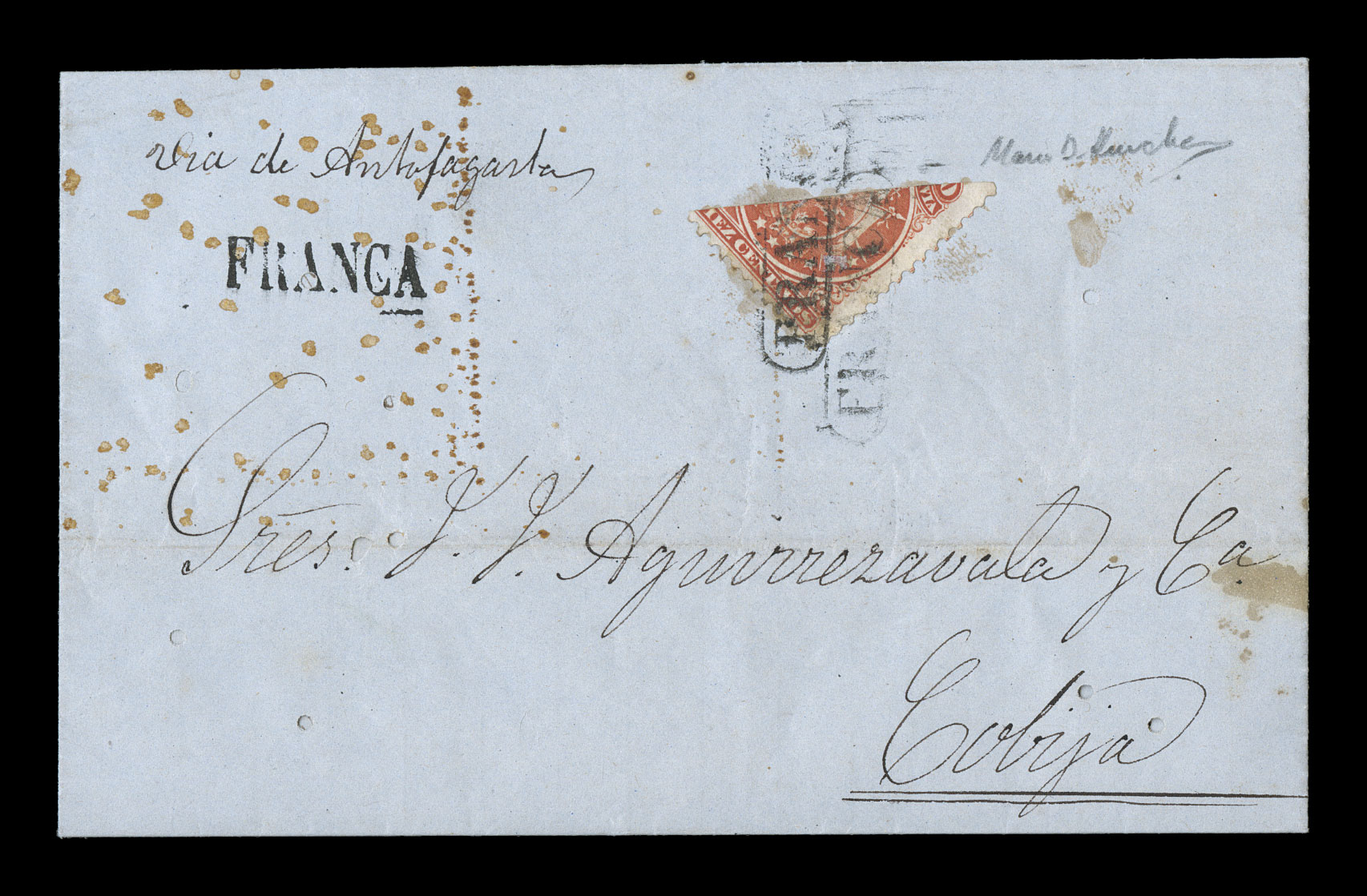 30, 1874 at Sucre, the stamp is tied by two heavy indistinct double#17, 1869 50c Blue, an extraordinarily rare single franking on folded entire foreign mail letter to France via the British Postal Agency in Cobija, letter is datelined August 30, 1874 at Sucre, the stamp is tied by two heavy indistinct double-circle c.d.s. of Sucre, given to the British post office with black "Cobija/C/SP 21 74" c.d.s., sent due by British packet with Callao and London transits on the reverse, Calais entry plus several French transits, backstamped Masseube, a rather heavy letter being charged "30" decimes due and with "GB/1F90c" British accounting handstamp, cover has considerable fold separation that has been hinged reinforced, portion of top flap missing with small pieces missing from the front which have all been mended for appearance sake by adding a piece at top, but not affecting the stamp or markings; otherwise fine; an incredibly rare cover, not only being a combination between the Bolivian post office and the British Agency, but this is one of only two covers known with the Eleven Star Fifty Cent value. (Image) Est. $1,500-2,000