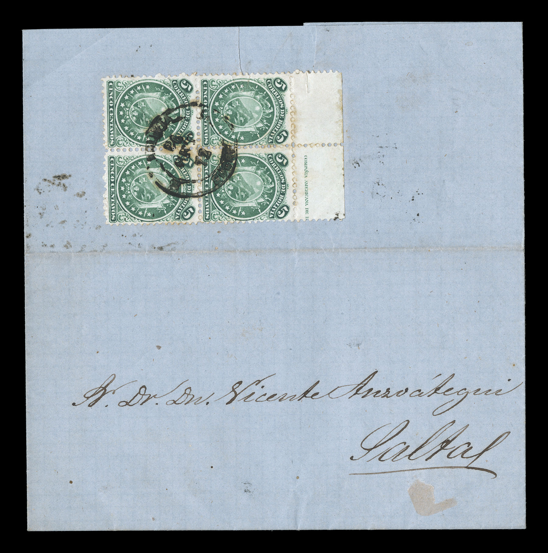 domestic and foreign rates to neighboring South American countries, it start1869 Eleven Star postal history collection, a neatly mounted study of the various usages of this issue consisting of 31 attractive covers, emphasis is put on the various domestic and foreign rates to neighboring South American countries, it starts with two single frankings of the 5c Green for the letter rate within the same department, and includes a very rare 10c bisect cover for a cover that apparently was posted within the the Litoral Department, the normal usage time of most covers of this issue is the early 1870's having been issued in November of 1869, but also includes a letter dated and postmarked December 17, 1869 with pair of 5c Green, this is the earliest cover the collector has seen of any Eleven Star issue, the collection includes numerous domestic covers paying various rates with combinations of the 5c and 10c values, also includes some nice foreign usages including two 10c frankings (one with two 5c, other with 10c single) on covers to Valparaiso being a special 10c rate for the Bolivian Litoral district to Chile, also eight covers paying the 20c rate to Argentina or Peru including two with blocks of four of the 5c Green, covers are collected for their different town usages for the various rates, overall clean and attractive with many nice covers of this popular 19th century issue, fine-very fine. (imagea) (imageb) (imagec) (Image) Est. $4,000-5,000