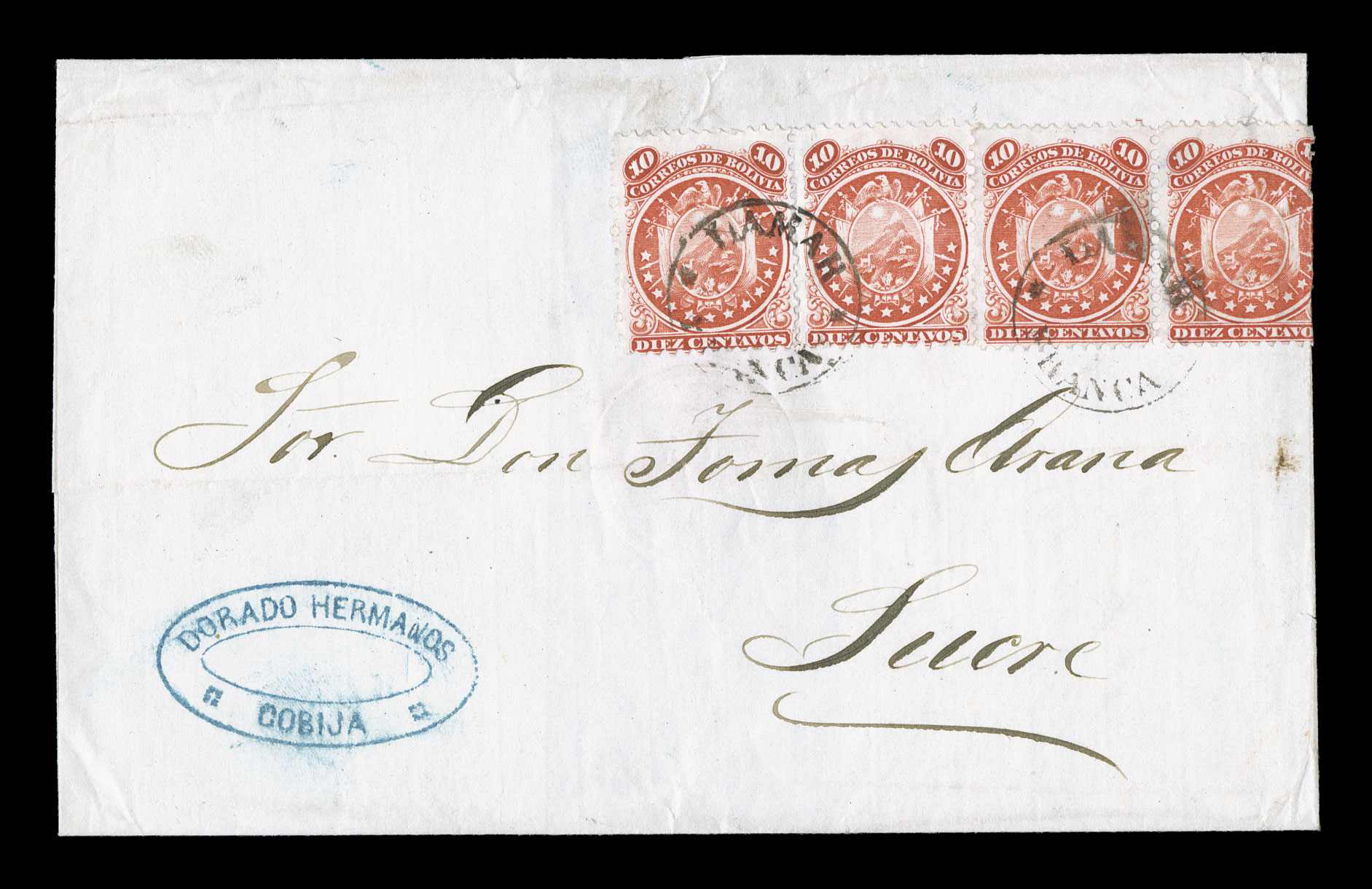 Stbre 1868 c.d.s., posted to La Paz, ms. 40cs. rate marking for le#11, 1868 10c Vermilion, two well centered pairs of the Nine Star issue, attractively tied to multiple rate entire folded letter by two strikes on each of "Bolivia/Cochabamba/1 Stbre 1868" c.d.s., posted to La Paz, ms. "40cs." rate marking for letters weighing over 1 oz. up to 2 oz, very fine and attractive; interesting historical content in the letter mentioning an earthquake in Cochabamba; a lovely and rare early 19th century cover. (Image) Est. $500-750