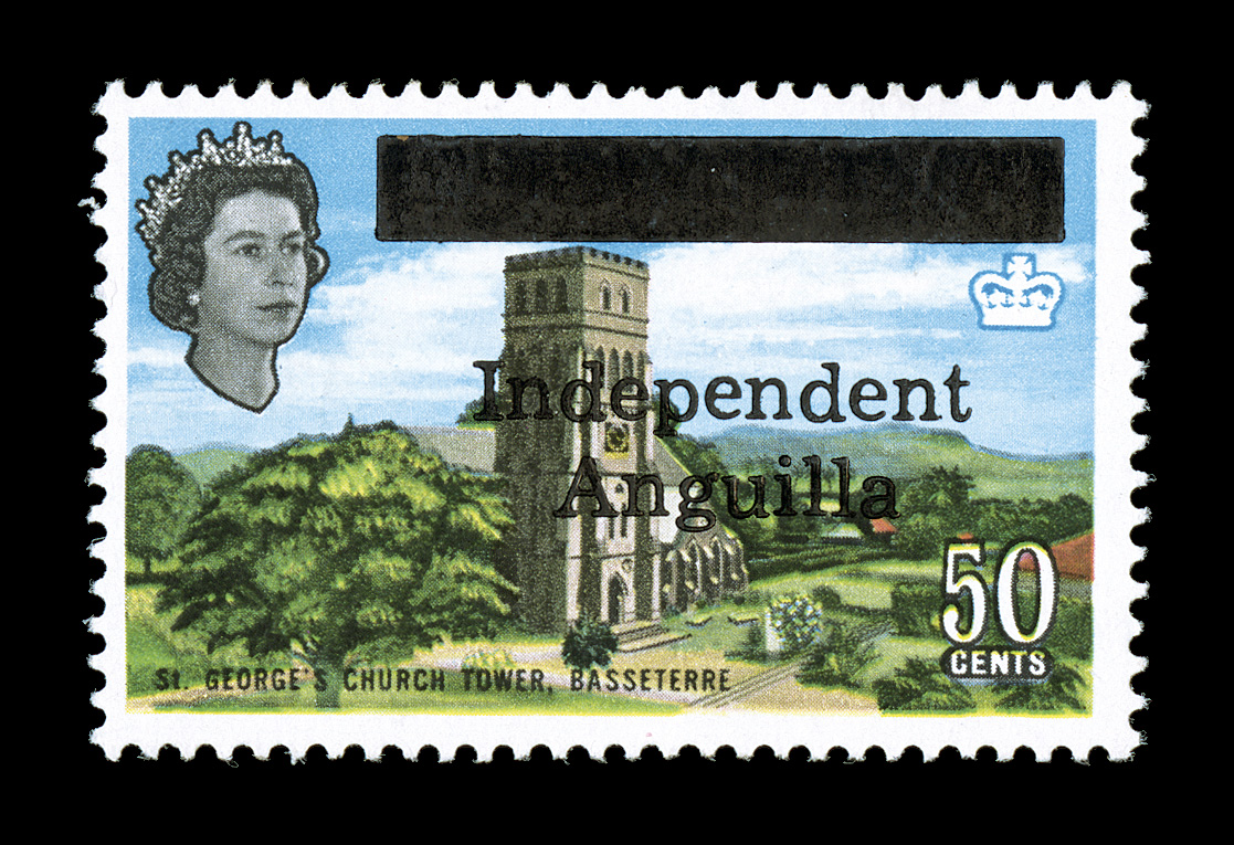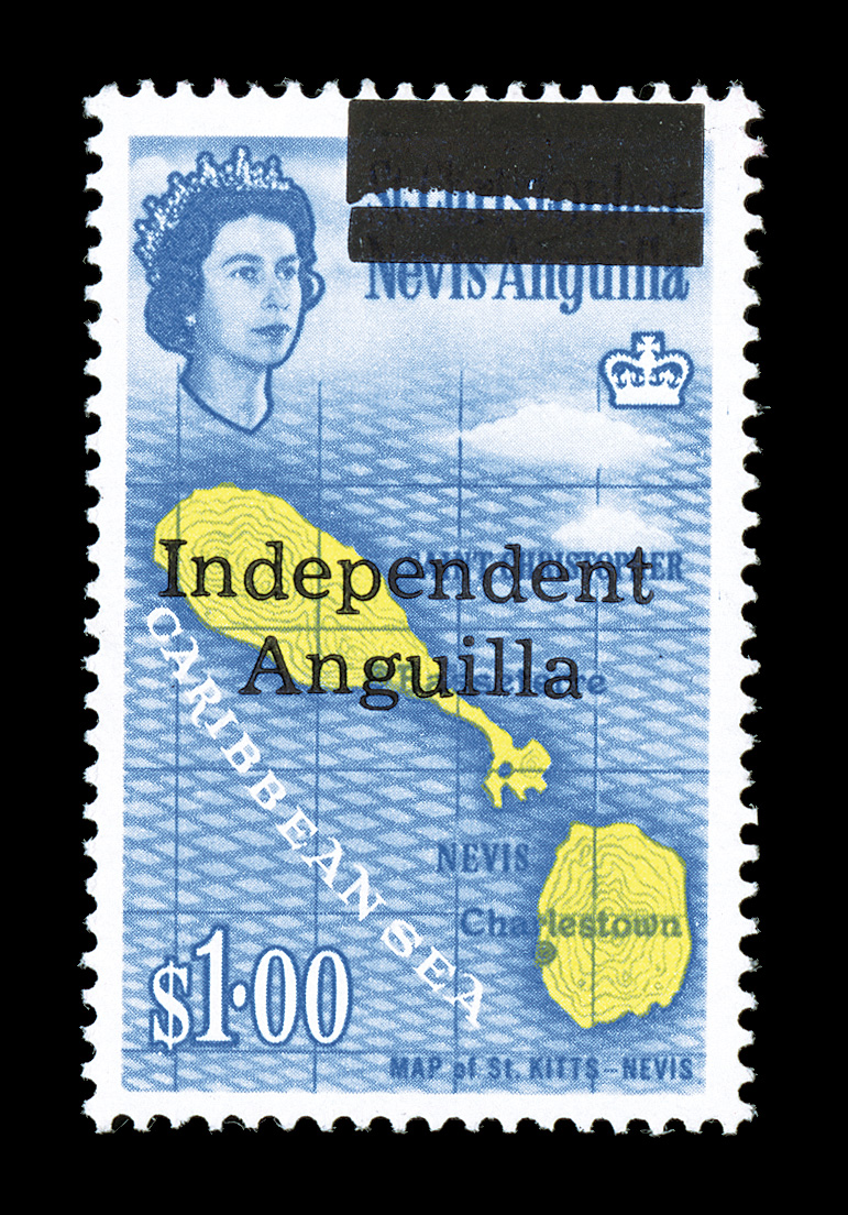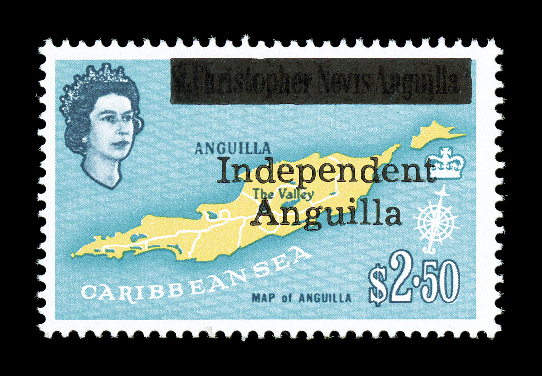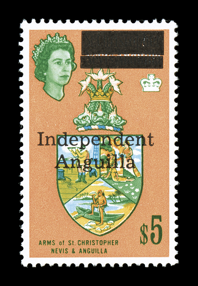 these rare overprints, which were issued in very limited quantS.G. #1-16, 1967 1/2c-$5.00 "Independent/Anguilla" overprints cplt., bright and fresh, o.g., n.h., 3c, 20c and 25c with light owner's handstamp on gum, very fine; a lovely mint set of these rare overprints, which were issued in very limited quantities due to the shortage of available stocks for overprinting, making these among the rarest stamps of the entire Elizabethan era; 1969 Bridger and Kay certificate for the set that is signed by Robson Lowe (Scott #1-16; $15,235.00). (imagea) (imageb) (imagec) (imaged) (Image) £11,000