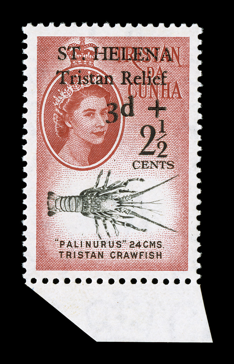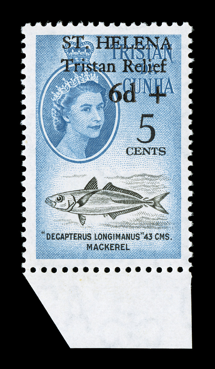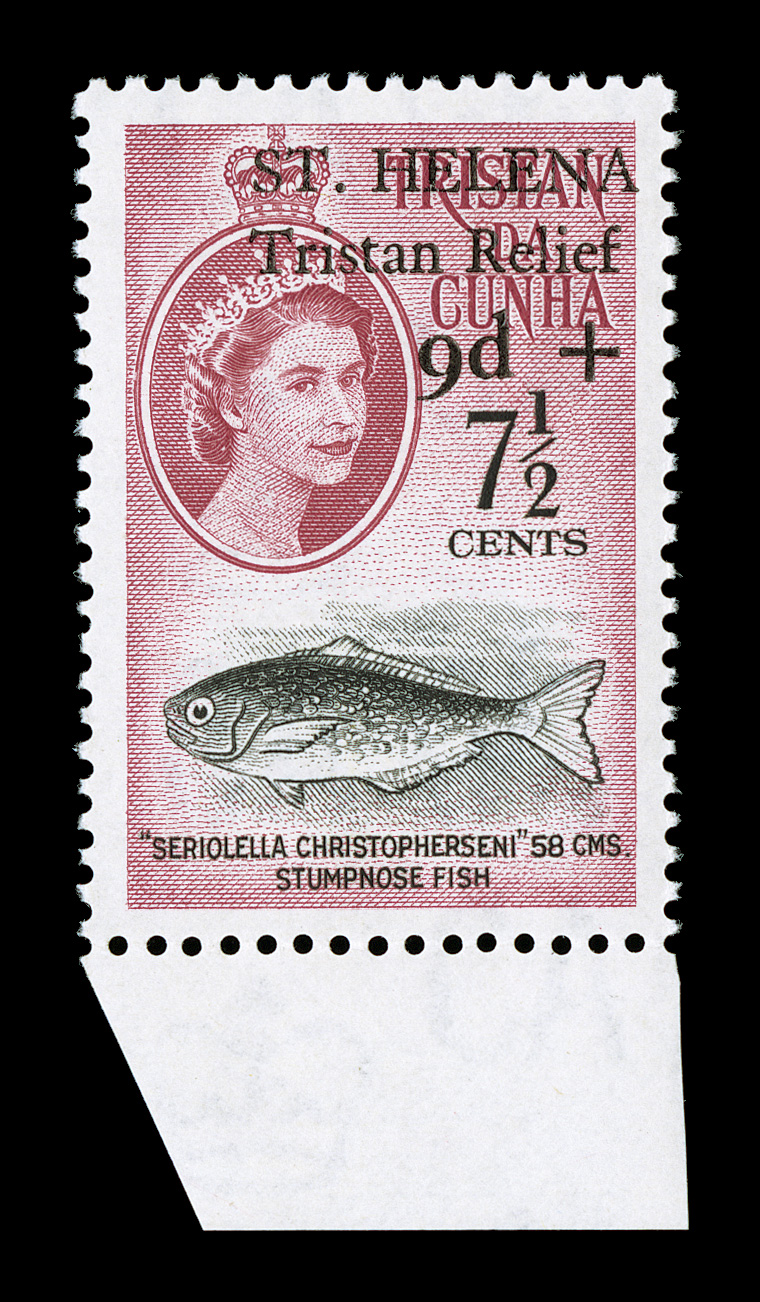 centered, wonderfully bright and fresh, o.g., never hinged, extremely fineS.G. #172-75, 1961 3p to 1/- Tristan Relief surcharges cplt., a beautifully matched set of bottom sheet-margin singles, each being from position 5/2, extraordinarily well centered, wonderfully bright and fresh, o.g., never hinged, extremely fine; one of the very finest sets available of this Queen Elizabeth II rarity, with only 434 sets sold before being withdrawn from sale; 1975 BPA certificate for the set (Scott #B1-4; not priced mint). (imagea) (imageb) (imagec) (Image) £5,500