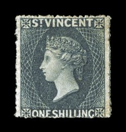 (Scott 8A $3,000.00).S.G. #8, 1866 1/- Slate grey, perforated 11 to 12 1/2, lovely rich color in the rare slate grey shade, strong impression as well, o.g., minor h.r., fine; 1961 RPS certificate (Scott #8A; $3,000.00). (Image) £2,500