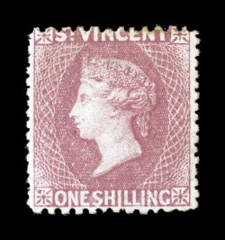 marks on face and the reverse may have had some toning removed, fineS.G. #20, 1873 1/- Lilac rose, perforated 11 to 12 1/2 x 15, an exceptionally rare unused example, strong rich color and a crisp impression, traces of o.g., a couple tiny stray marks on face and the reverse may have had some toning removed, fine appearance (Scott #22; $6,500.00). (Image) £5,500