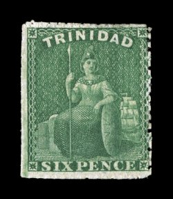 right which causes a faint trace of staining, fine appearance the fS.G. #28, 1859 6p Deep green, top sheet-margin unused single, rich bright color and a deeply etched impression, just into the design at bottom right, minute closed tear at top right which causes a faint trace of staining, fine appearance; the first unused example of this stamp we have ever offered; 1953 BPA certificate (Scott #16; $15,000.00). (Image) £12,000