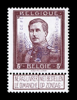 lightly hinged, very fine one of the key stamps to completing a Belgium#Q60, 1915 5Fr Plum railway stamp, a lovely mint example of this high value rarity, deep color and a sharp detailed impression on bright white paper, nicely centered, o.g., lightly hinged, very fine; one of the key stamps to completing a Belgium collection; only 200 printed; signed A. Diena and accompanied by 1969 PF and 1986 Jean Baete certificates (Michel #57; €4,000). (Image) $3,500.00