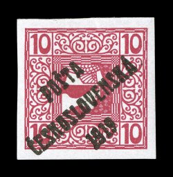 signed numerous times and accompanied by a 1986 PF certificate#B26, 10h Carmine with Posta/Ceskoslovenska/1919" overprint, very large margins all around, marvelously bright and fresh, o.g., lightly hinged, extremely fine; only 250 were printed; signed numerous times and accompanied by a 1986 PF certificate (Michel #98; €2,000). (Image) $2,250.00