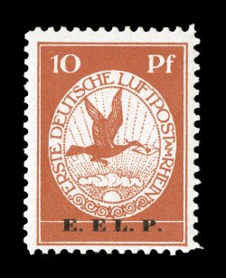 Bloch.Michel #V-VI, 1912 10pf and 20pf Red brown semi-official air posts with "E.EL.P." overprints cplt., fresh color, o.g., lightly hinged, fine-very fine; both signed H. Bloch. (Image) Michel €1,030
