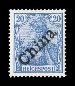 signed Bothe (Michel 11 Ç1,000).#20, 1900 20pf Ultramarine with Tientsin "China" provisional overprint, strong rich color on bright paper, o.g., h.r., tiny trace of a pinpoint thin speck, otherwise very fine; signed Bothe (Michel #11; €1,000). (Image) $700.00