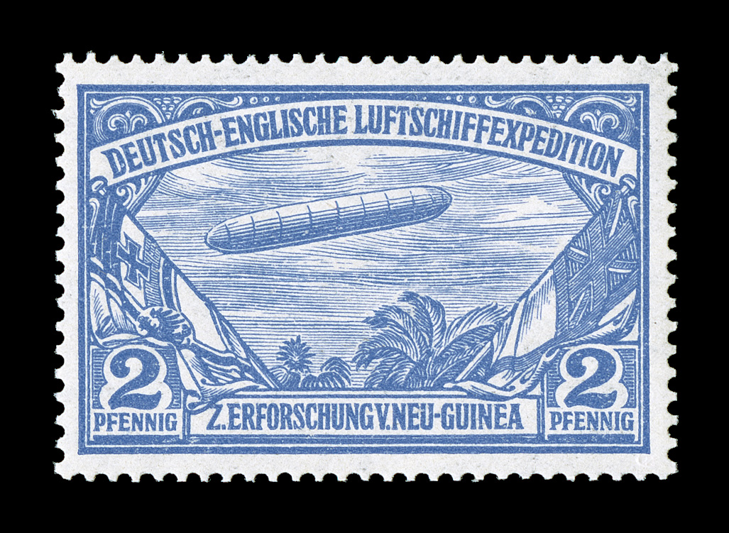 scarce stamps, which were never put into use due to the cancellation of1913 2pf and 1M Unissued New Guinea expedition zeppelins cplt., both are well centered and exceptionally fresh, o.g., n.h., very fine and choice; a highly select set of these scarce stamps, which were never put into use due to the cancellation of the planned German-English expedition of New Guinea; each signed Grobe and accompanied by his 1967 certificate for the set. (imagea) (Image) Sieger €2,500