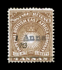 tiny mark in the top margin, fine the key rarity of the MombasS.G. #21, 1891 "1 Anna" Dull violet Mombasa provisional surcharge on 4a Brown, initialed "A.B.", lovely rich color, small part o.g. (certificate says traces of o.g.), insignificant tiny mark in the top margin, fine; the key rarity of the Mombasa provisionals, we doubt more than a handful of genuine unused examples exist; 2008 BPA certificate; ex-Ferrary, Hind and Dale-Lichtenstein (Scott #32; $9,750.00). (Image) £10,000