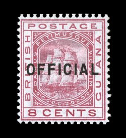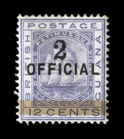 c.d.s., very fine one of the key rarities of British Guiana thatS.G. #147, 1878 (1c) on 4c Blue, "OFFICIAL" ruled through with one horizontal and one vertical bar, used as are all known examples, deeply rich color, nicely centered, unobtrusive c.d.s., very fine; one of the key rarities of British Guiana that is on virtually every collector's want list; signed H. Bloch and accompanied by his 1968 Friedl certificate, as well as a 2008 BPA certificate; ex-"Samos" (formerly Scott #88, now listed as #85a; $3,000.00). (Image) £3,250