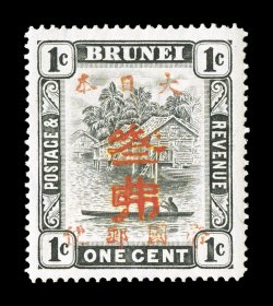 finest quality examples known, possessing extraordinary freshnessS.G. #J20, 1944 $3.00 Surcharge on 1c Black with orange red occupation overprint, an outstanding mint single of this important Japanese Occupation rarity, being among the very finest quality examples known, possessing extraordinary freshness and excellent centering, fresh clean o.g. unlike the typical dried or dull gum found on most of the occupation issues, lightly hinged, extremely fine; 1991 RPS and 2008 BPA certificates (Scott #N20; $6,000.00). (Image) £6,000