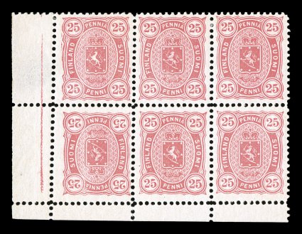 marvelously bright and fresh, unusually well centered (especially when compar#29b, 1875 25p Rose, perforated 12 1/2, tête-bêche pair, the error pair being in the bottom left corner (position 91) in a bottom left corner sheet-margin block of six, marvelously bright and fresh, unusually well centered (especially when compared to the few other existing copies), pristine o.g., very lightly hinged on a few stamps (the tête-bêche position being n.h.), just a few separated perforations in the bottom sheet selvage, very fine and striking; irrefutably the finest of the mere seven recorded examples of this inverted cliché error; unpriced both in Facit and Scott; 1997 Gummesson certificate; ex-Fabergé, Mellgren (Facit #17LC2v1). (Image) Est. $15,000-20,000